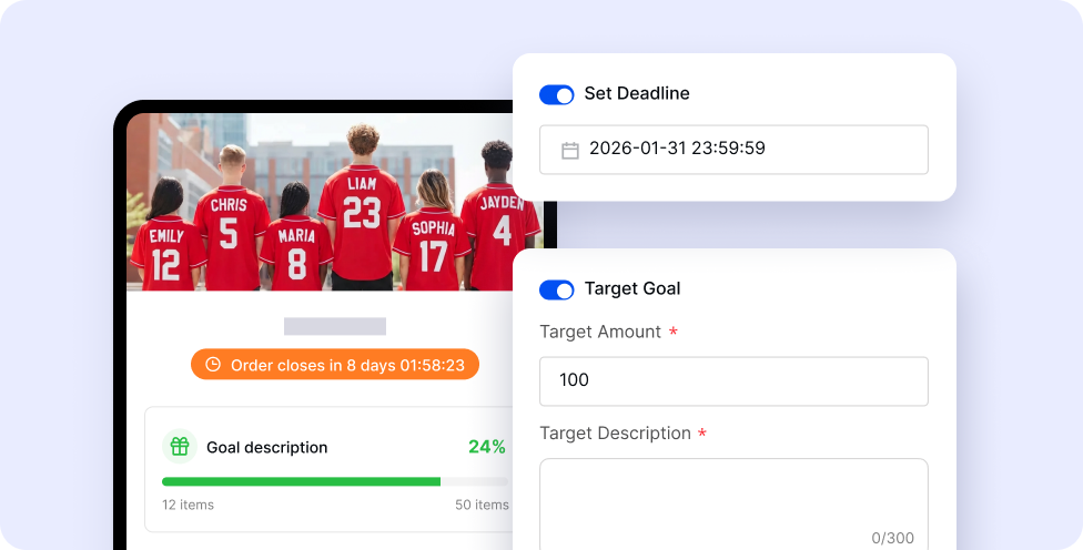 Eliminate back-and-forth emails and spreadsheet chaos. Collect designs, manage payments, and hit your target quantities seamlessly.